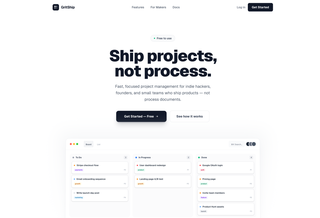 GritShip is a fast, focused project management tool built specifically for product makers — indie hackers, solo founders, freelancers, and small teams who ship products, not process documents. Unlike the WordPress plugins above, GritShip is a standalone web app, so it works regardless of what platform your site runs on.