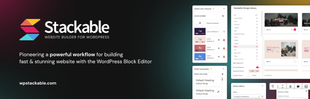 Stackable is a popular Gutenberg block plugin that helps you create modern and visually appealing pages directly within the WordPress block editor. It adds a collection of flexible blocks designed for building landing pages, business websites, and marketing layouts without relying on external page builders.