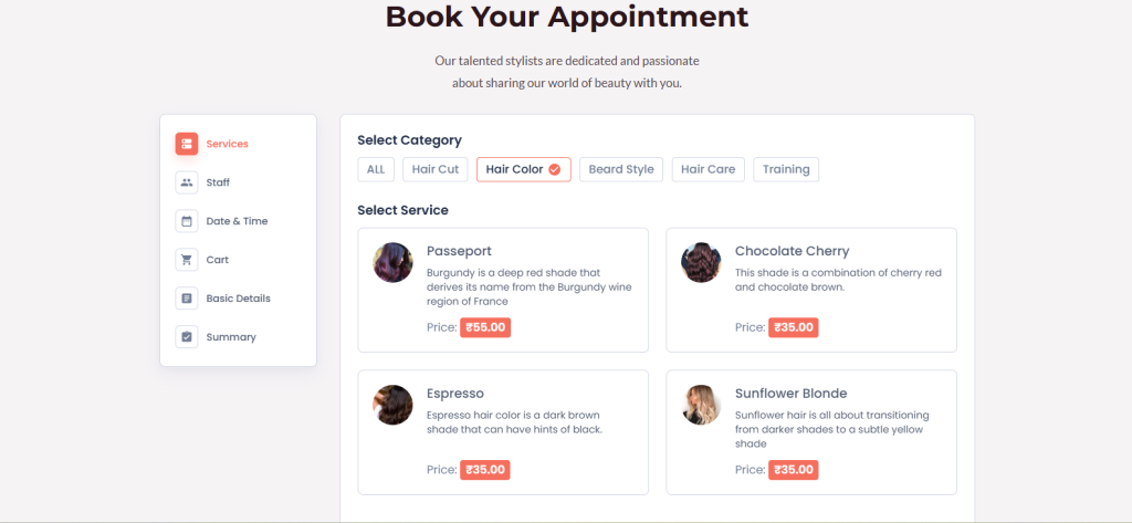 Customers can choose the date, time, their desired services, and select their desired assistant during the booking process. You can configure the plugin settings from the Salon > Settings page of your dashboard.
