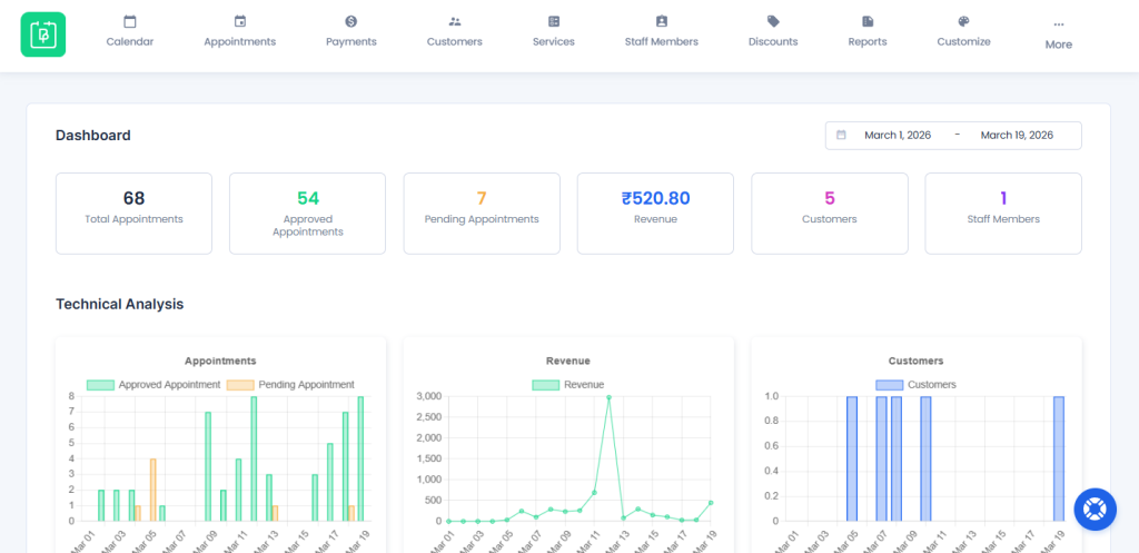 The admin dashboard shows you everything you need to know about your salon, from appointments, customers, staff to revenue. Plus, it shows you a technical analysis graph of your appointments, revenue and customers between dates. If you scroll down, you’ll also see the upcoming appointments, which you can modify right from here or by going to the “Appointments” panel.